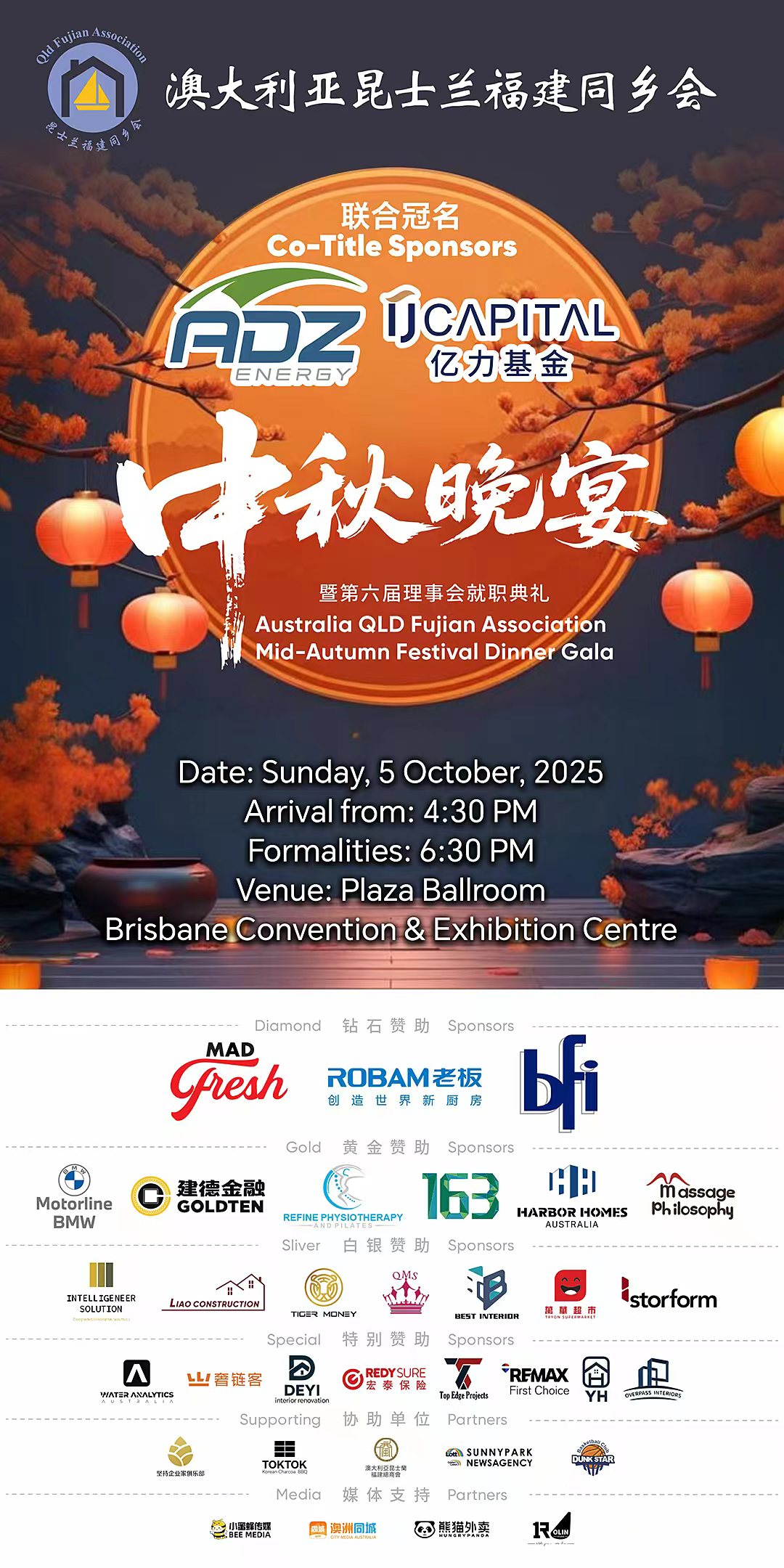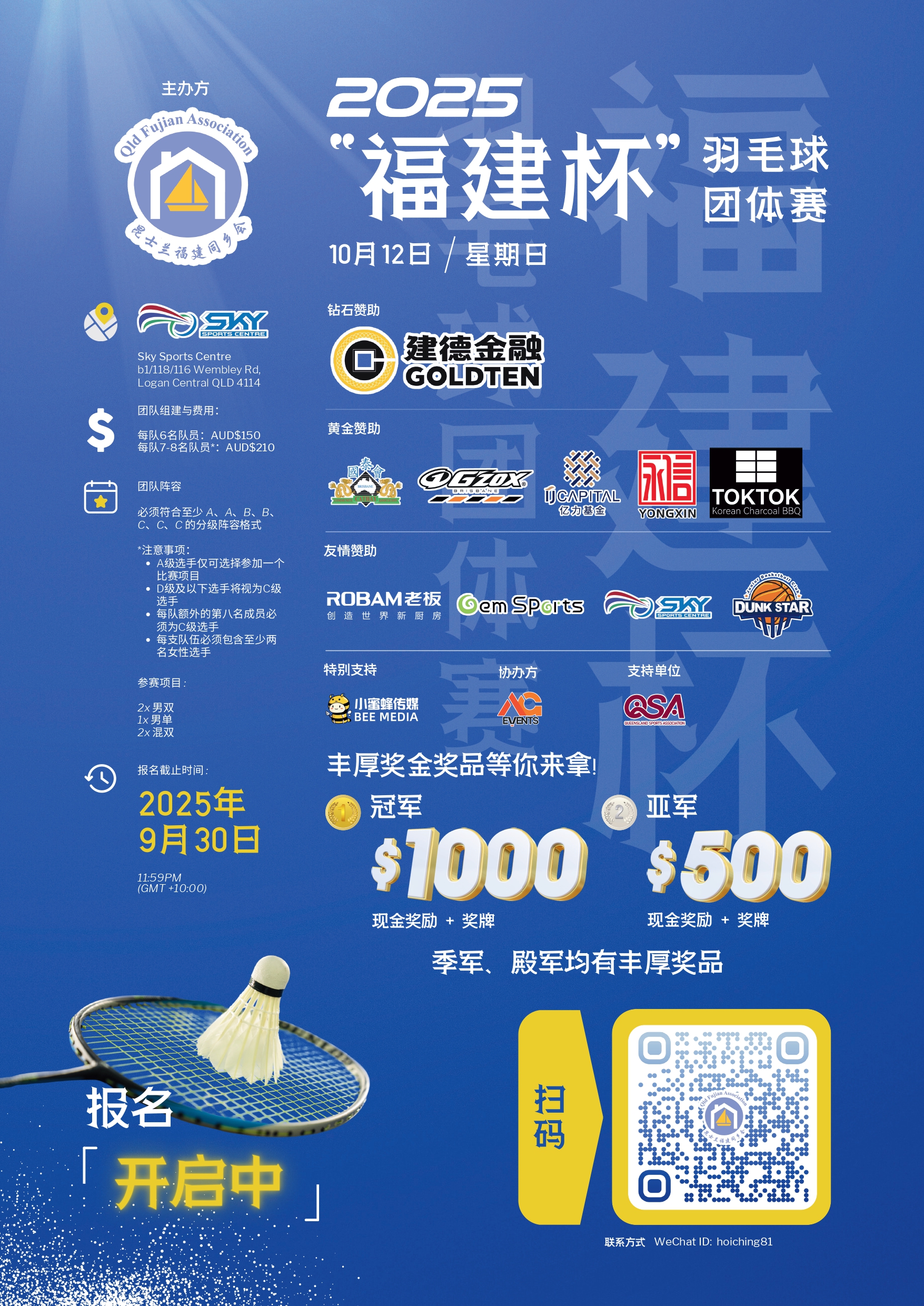 2025 中秋晚会 正在筹备中🌕 月满中秋 · 情系侨心典雅的乐声、醇厚的乡情无论天涯海角,中秋团聚而圆📅 时间:2025年10月5日🏛 地点:布里斯班会展中心 预热派对 16:30开始趣味游戏、博饼挑战、乐队Live驻唱 正式晚宴 18:30开始经典怀旧歌曲、中西乐器合奏、音乐剧、民族与西方歌舞 【$230/人】 一站式尊享晚宴、美食、派对与赢取大奖的机会!🔥席位有限,立即购票🔥 报名方式: 请联系 0480747050 & 0425568715 2025福建杯 羽毛球团体赛 ✌️一场不可错过的羽毛球盛事!🏅冠军现金奖励$1000🥈亚军现金奖励$500 还有各种丰厚奖品等你来解锁~ 报名截止至:9月30日 👇欢迎感兴趣的小伙伴联系我们:📧比赛咨询:agbadm.events@gmail.com📧其他咨询:info@qldfujian.com.au